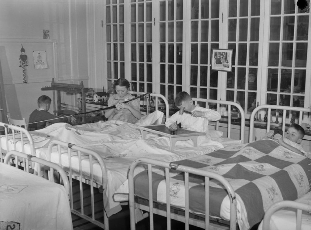 Des enfants alités dans une salle commune sont affairés à des jeux. La scène se déroule à l'hôpital Shriners Hospital for Crippled Children, avenue Cedar à Montréal