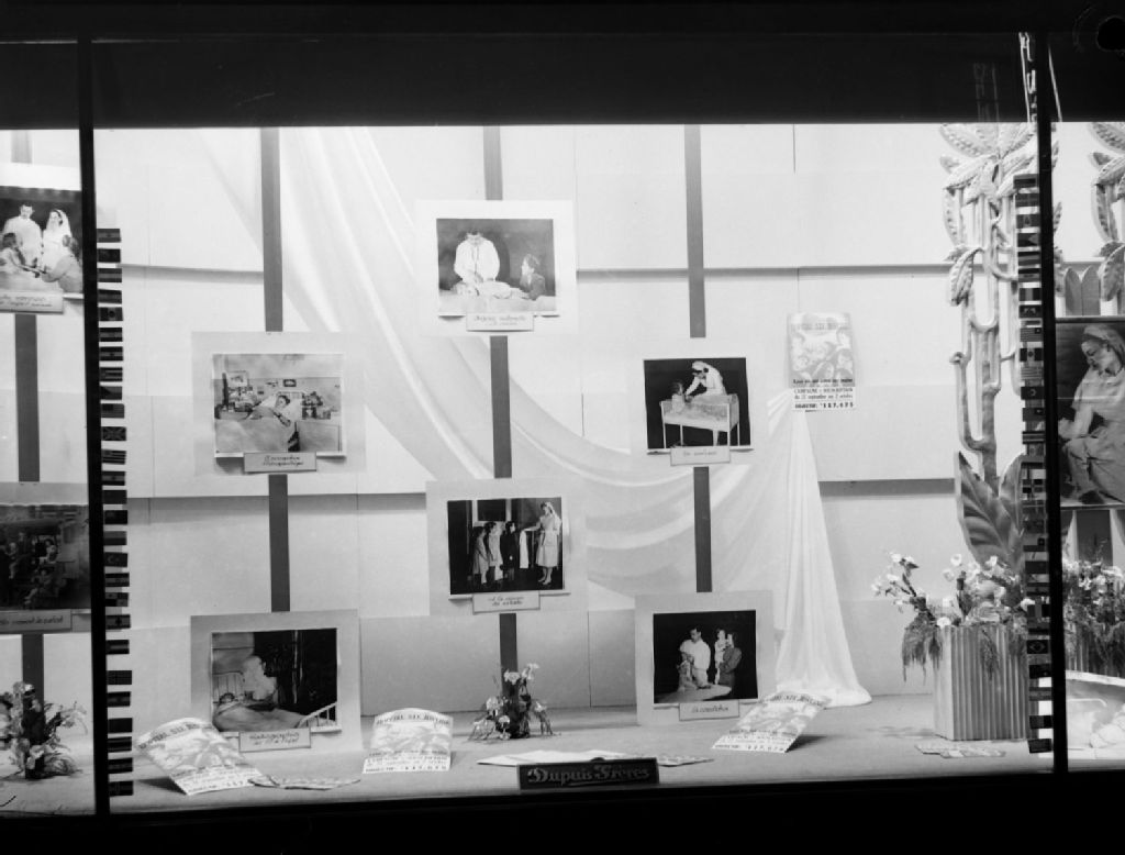 Vitrine où sont exposées des photographies montrant les soins donnés aux enfants de l'hôpital Sainte-Justine située sur la rue Saint-Denis à Montréal. Il s'agit d'un étalage réalisé pour la campagne de souscription annuelle