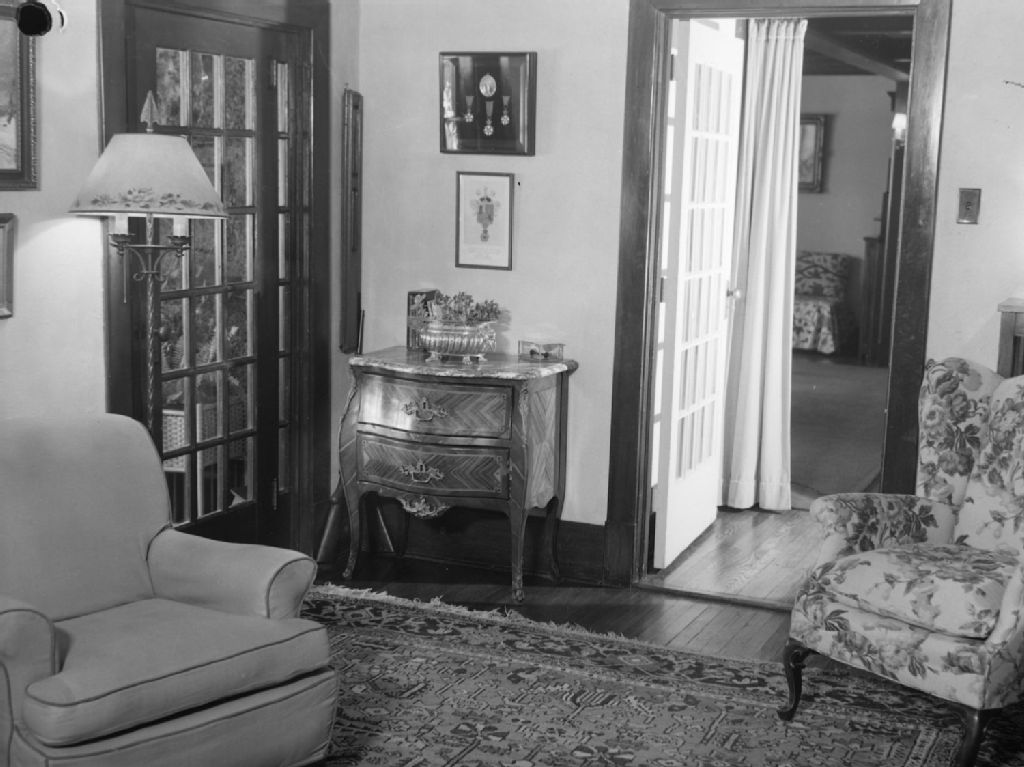 Salon orné de portes françaises où se trouvent deux fauteuils dont une bergère, des lampes, des cadres contenant des médailles et une commode. La maison est située à LaSalle
