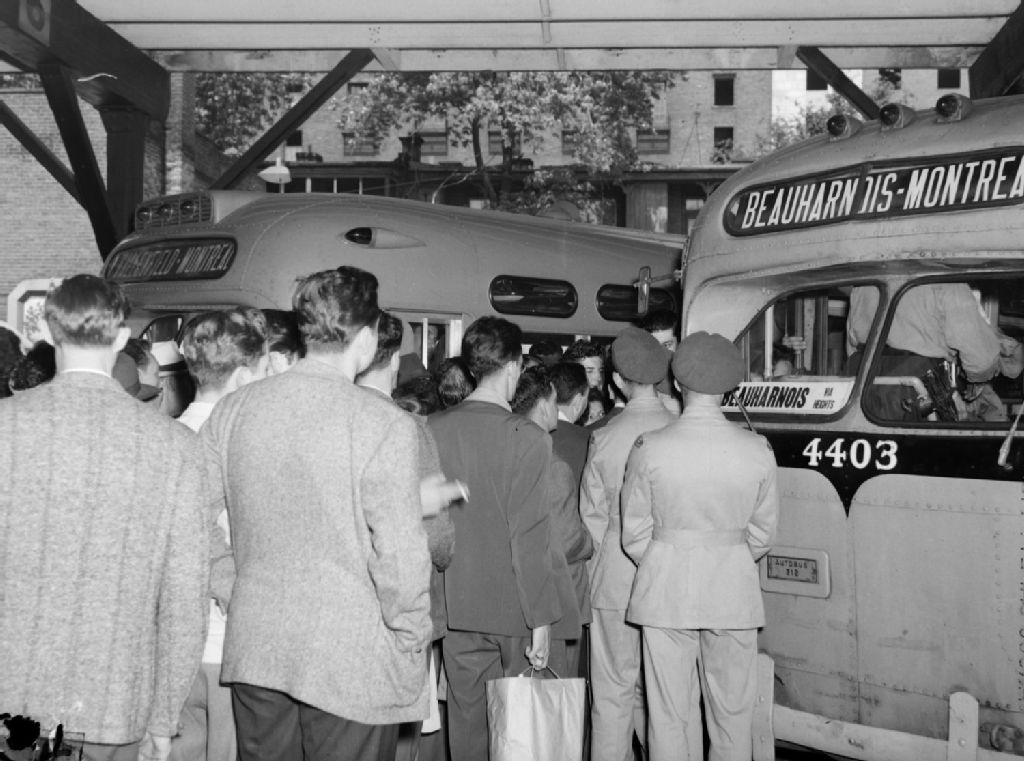 Voyageurs au terminus d'autobus. Les passagers sont rassemblés devant les autocars assurant les liaisons Beauharnois-Montréal et Valleyfield-Montréal
