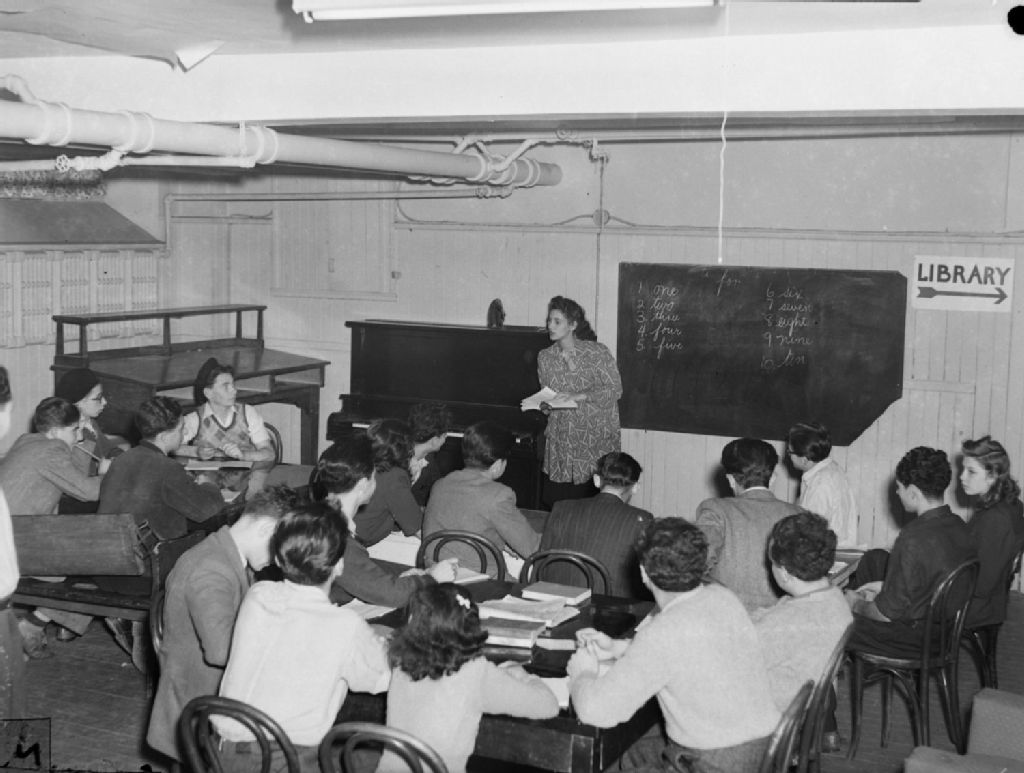 Adolescents en classe en compagnie d'une enseignante. Dans la pièce se trouve un piano