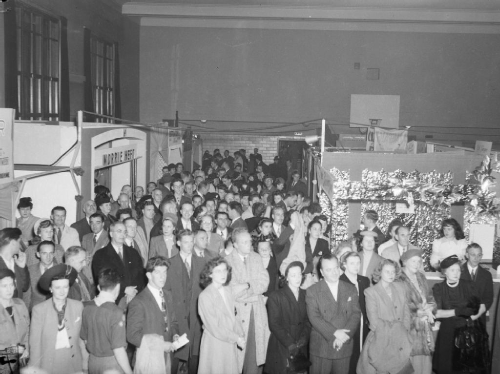 Exposition dans le quartier Notre-Dame-de-Grâce à Montréal où les visiteurs sont réunis dans l'allée centrale du bâtiment. Parmi les exposants, nous remarquons la commerce de vêtements et de meubles Morrie Heft