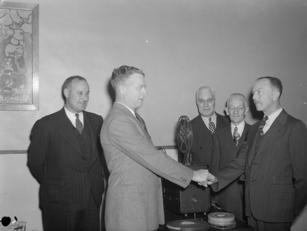 Des hommes échangent une poignée de main lors d'une projection de film organisée par le Rotary Club of Montreal. L'événement a lieu au Iverley Community Center de la rue Coursol à Montréal