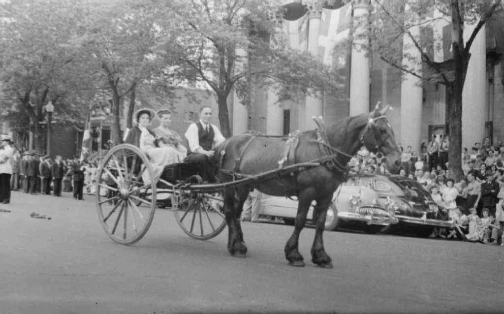 Un cheval tire une calèche où se trouvent deux femmes vêtues de robes d'époque. Tout autour se trouve la foule surveillée par des policiers. L'événement a lieu à l'occasion de la parade de la Saint-Jean-Baptiste dans les rues de Montréal