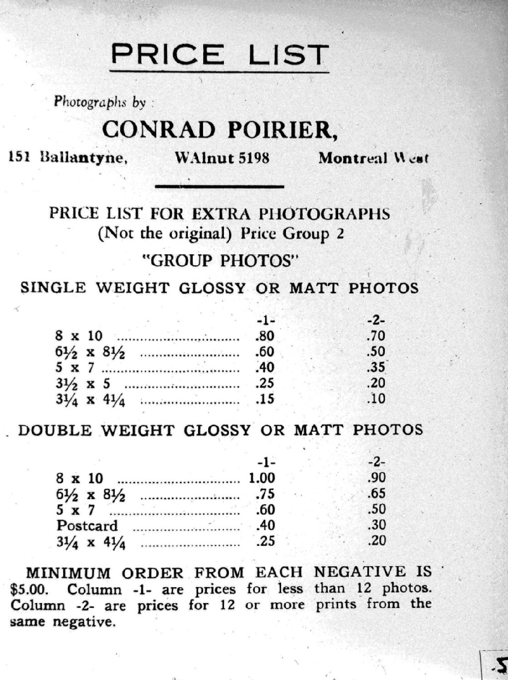 Liste de prix établie par Conrad Poirier pour le développement de photographies. Son entreprise est située sur l'avenue Ballantyne à Montréal-Ouest