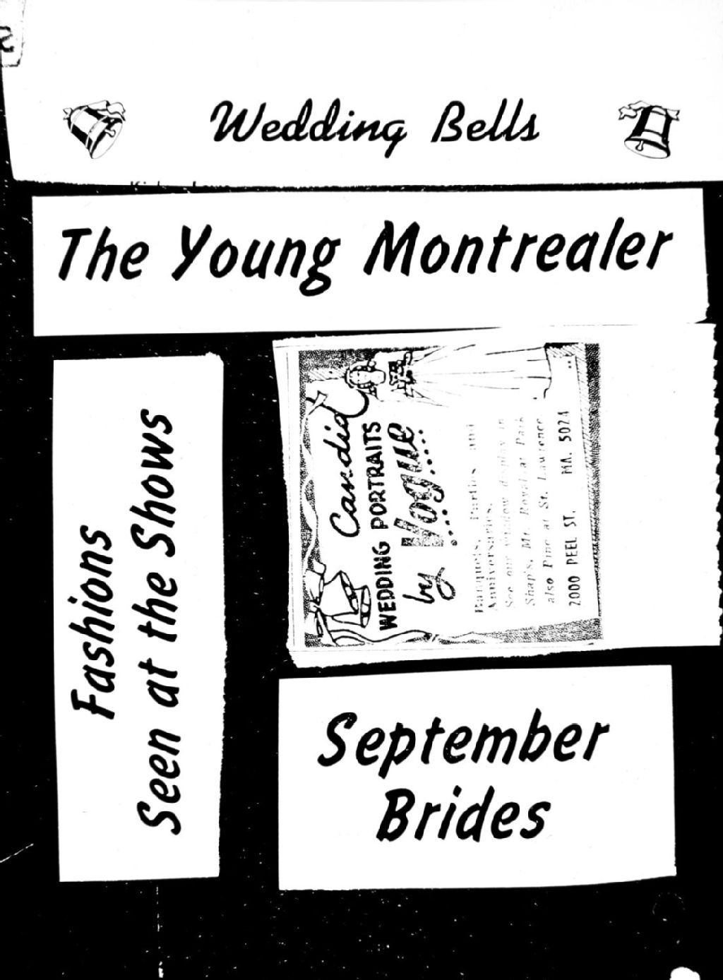 Affiches portant les énoncés suivants : «Fashions Seen at the Shows», «September Brides», «The Young Montrealer», «Wedding Bells». Une publicité porte sur le photographe Vogue de la rue Peel, spécialisé dans les albums de mariage