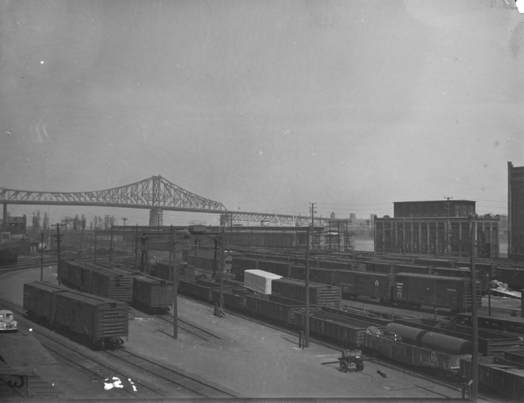 Cette image offre une vue du pont Jacques-Cartier, des installations ferroviaires situées à proximité du port de Montréal et de l'usine d'électricité qui a été démolie