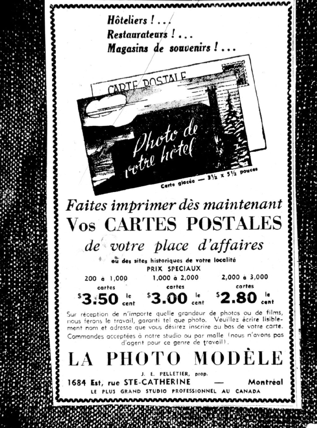 Annonce publicitaire du studio de photographie Photo Modèle de la rue Sainte-Catherine à Montréal