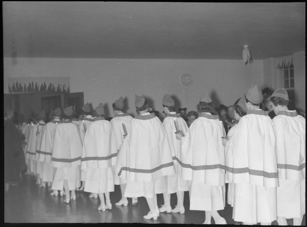 Nous voyons une chorale de jeunes filles portant des capes et des bonnets, réunie pour chanter des cantiques de Noël à l'intérieur du «Children's Memorial Hospital», rue Cedar à Montréal