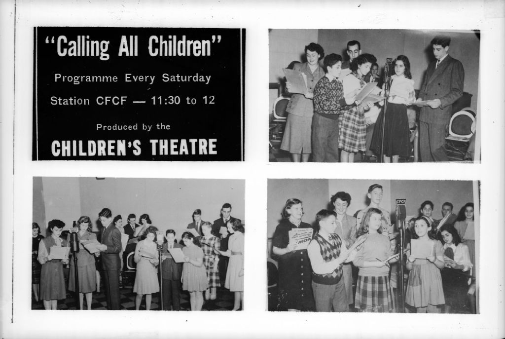 Une troupe de théâtre pour enfants participe à une émission radiophonique intitulée «Calling All Children» sur les ondes de C.F.C.F. Nous remarquons les comédiens qui enregistrent