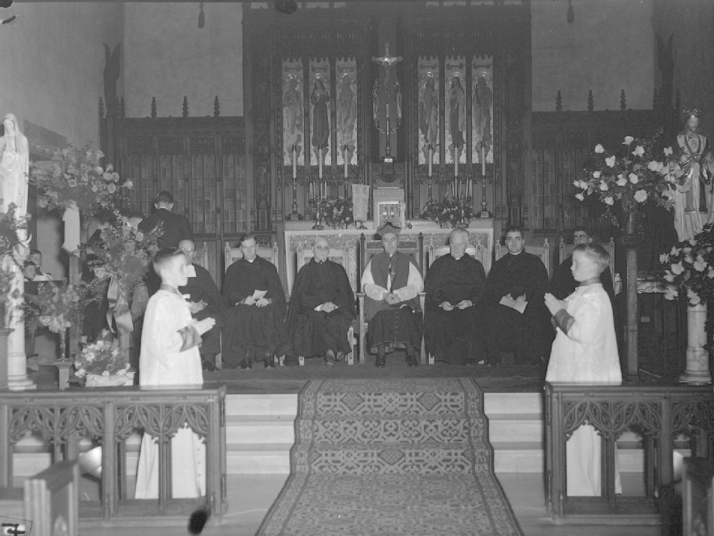Cérémonie religieuse dans le cadre d'une remise de diplômes de l'école St. Leon's Academy où l'on retrouve un évêque parmi les célébrants et des enfants de choeur. L'événement a lieu à l'église Church of the Ascension of Our Lord, avenue Kitchener à Westmount