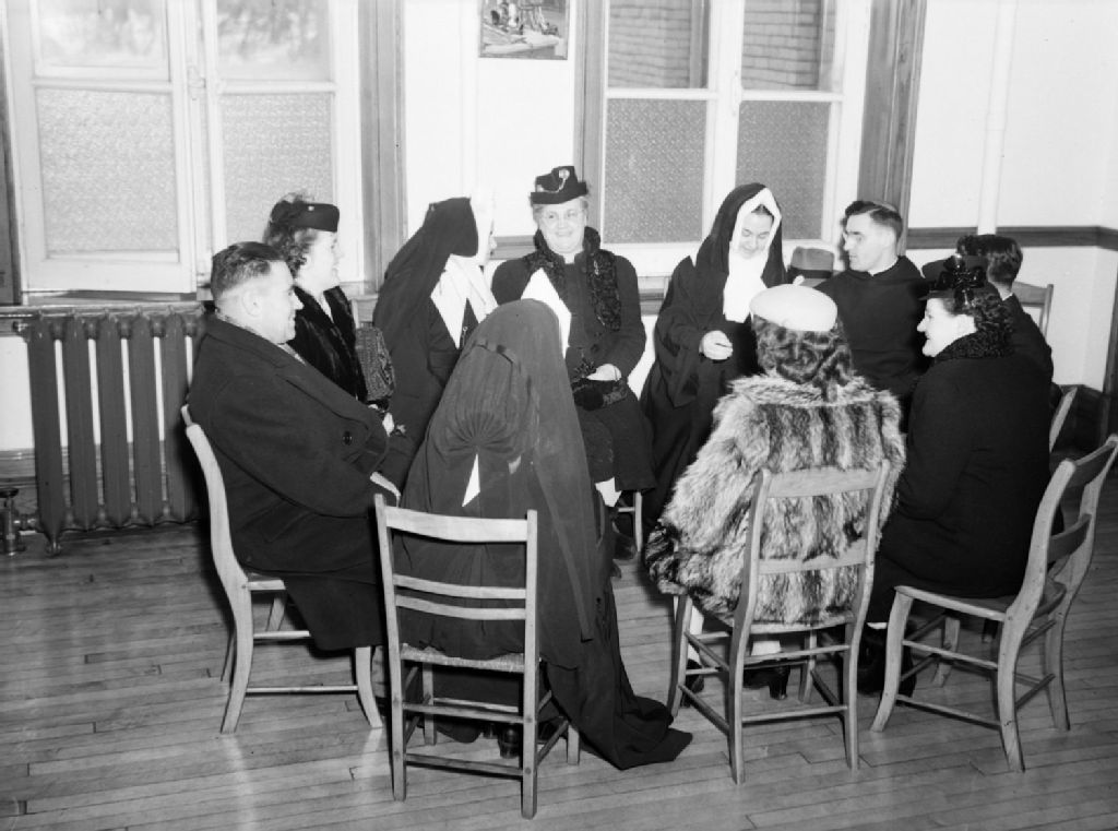 Des religieuses de la Congrégation de Notre-Dame conversent avec des visiteurs. Le groupe est réuni dans la salle de la communauté de la maison-mère (devenue le Collège Dawson) située sur la rue Sherbrooke Ouest à Montréal