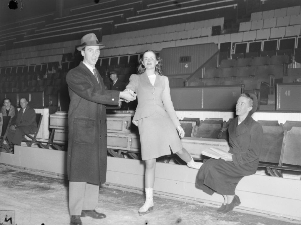 Skating. Ella Budge. Robert Dench. Rosemarie Stewart, 31 octobre 1947, Archives nationales à Montréal, Fonds Conrad Poirier, (06M,P48,S1,P15888), Poirier, Conrad.