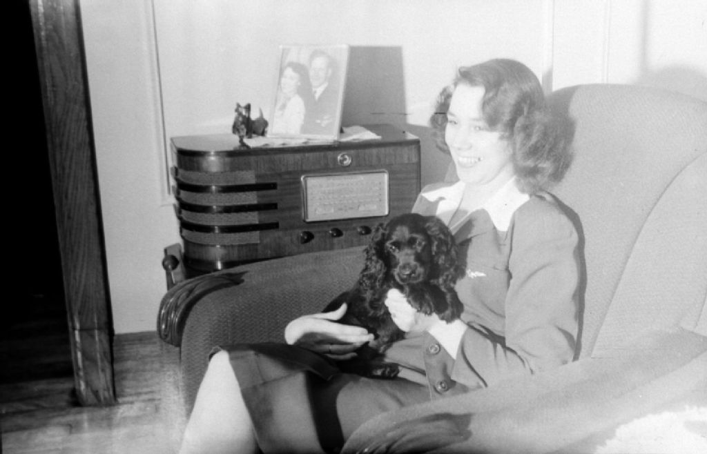 Rita Boke-Tempest se trouve au salon en compagnie de son chien épagneul. À proximité se trouve une radio