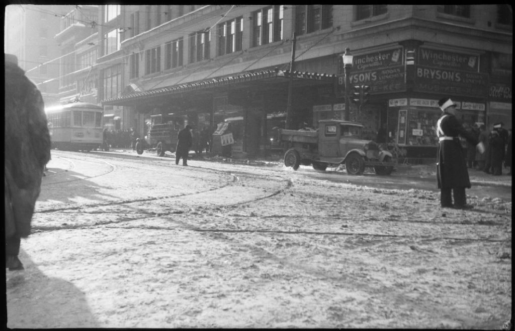 Nous voyons, à l'intersection des rues Peel et Sainte-Catherine à Montréal, un dégât d'eau causé par l'explosion d'une borne-fontaine. Nous apercevons un agent de la circulation, des camions, des rails de tramway, un tramway ainsi que quelques badauds devant des commerces avec des enseignes