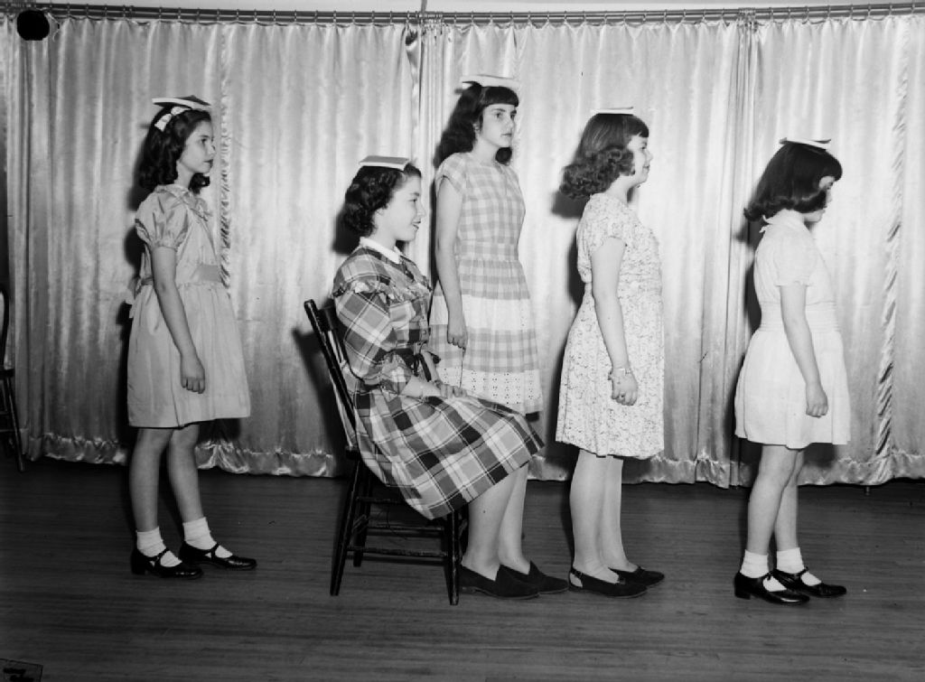 Jeunes comédiennes d'une pièce de théâtre pour enfants. Comme exercice de maintien, elles portent des livres en équilibre sur la tête