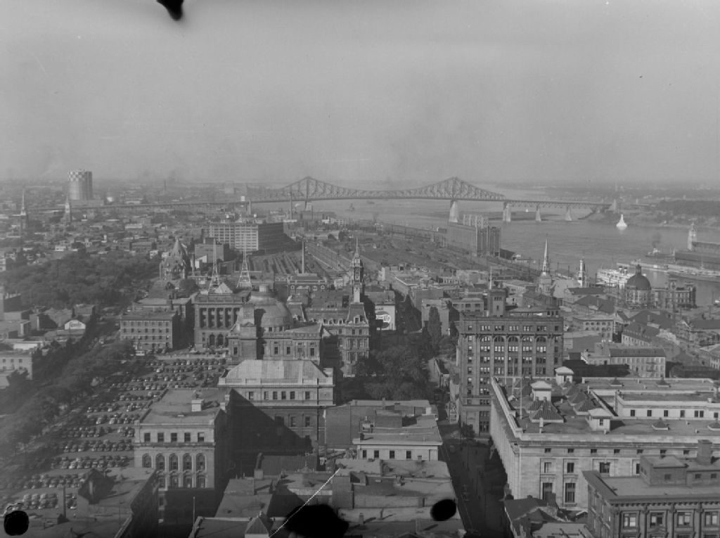 Vue du Vieux-Montréal mettant en relief la rue Notre-Dame de même que les installations ferroviaires à proximité du port de Montréal et du pont Jacques-Cartier