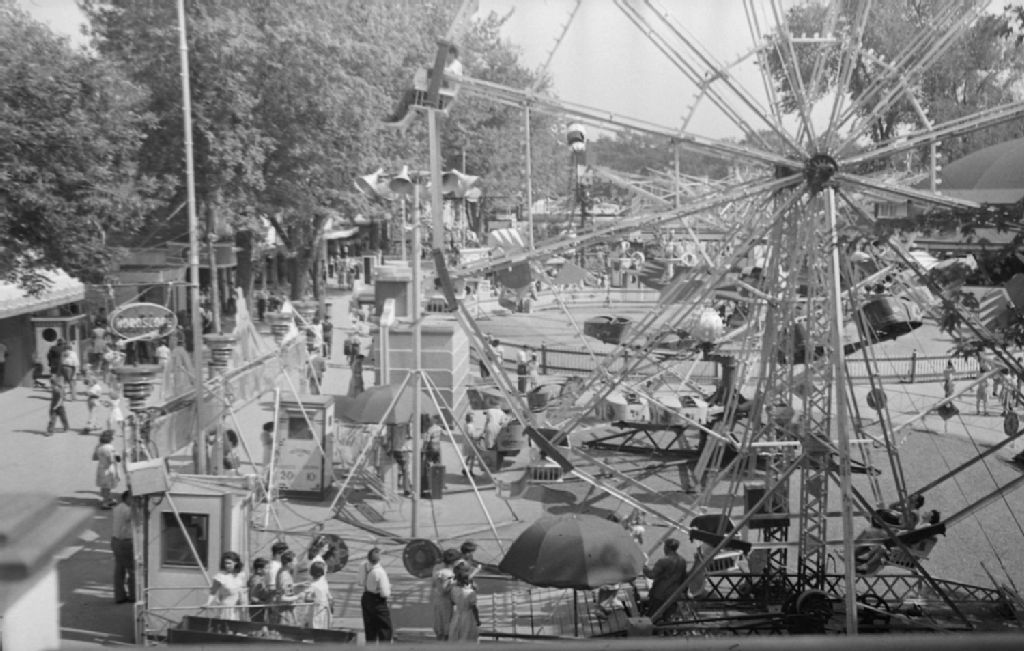 Sur le site du parc Belmont à Montréal, des visiteurs se promènent autour des kiosques et certains d'entre eux sont réunis dans le manège de la grande roue