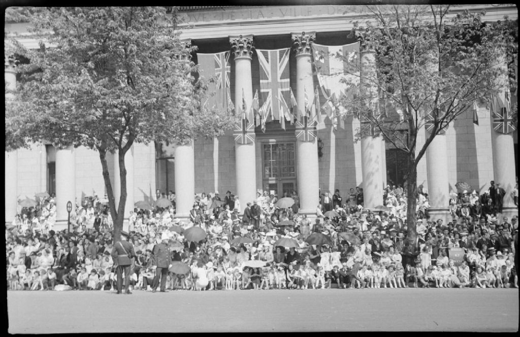 Lors de la parade de la Saint-Jean Baptiste, nous voyons une foule de gens en tenue de ville devant la façade de la bibliothèque municipale de Montréal, rue Sherbrooke Est