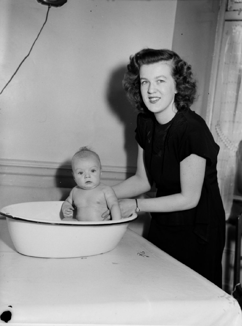 Madame Boxell donne un bain à son bébé John dans une cuvette de métal