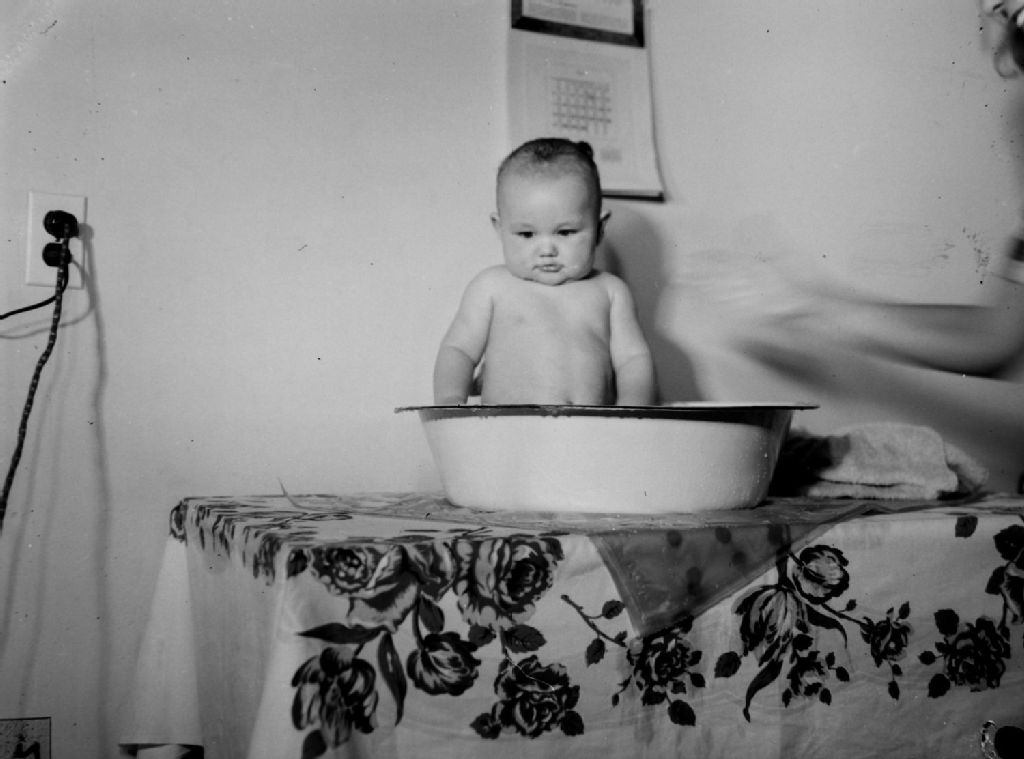 Le bébé Neil Tempest prend un bain assis dans une cuvette de métal posée sur une table