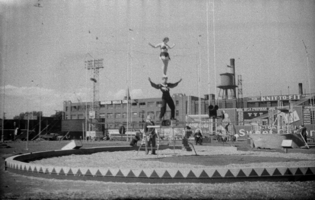 Des acrobates présentent des numéros de cirque au stade Delorimier à Montréal. Nous remarquons la manufacture Grover Mills Ltd. Knit to Fit à l'arrière-plan