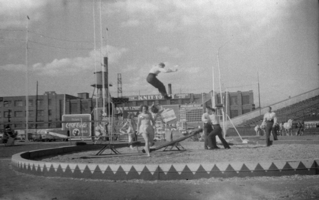 Des acrobates présentent des numéros de cirque au stade Delorimier à Montréal. Nous remarquons la manufacture Grover Mills Ltd. Knit to Fit à l'arrière-plan