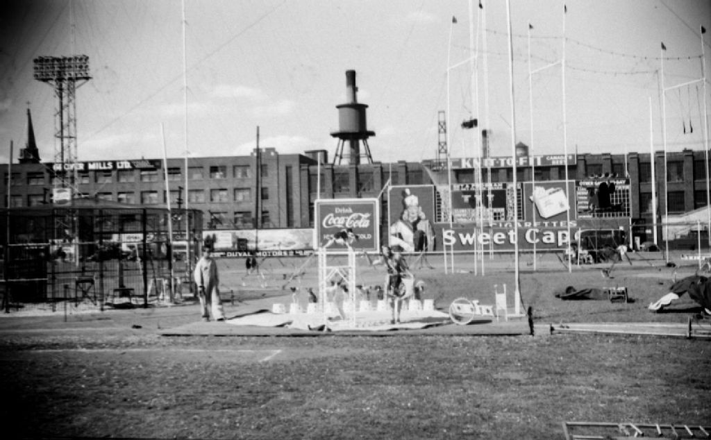 Une acrobate et des éléphants dressés présentent un numéro de cirque au stade Delorimier à Montréal. Nous remarquons la manufacture Grover Mills Ltd. Knit to Fit à l'arrière-plan