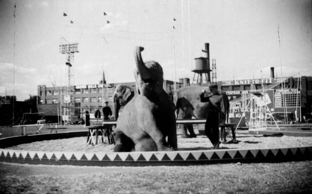 Trois éléphants dressés présentent un numéro de cirque au stade Delorimier à Montréal. Nous remarquons la manufacture Grover Mills Ltd. Knit to Fit à l'arrière-plan
