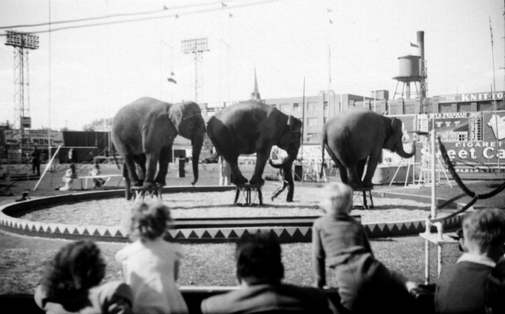 Trois éléphants dressés présentent un numéro de cirque au stade Delorimier à Montréal. Nous remarquons la manufacture Grover Mills Ltd. Knit to Fit à l'arrière-plan