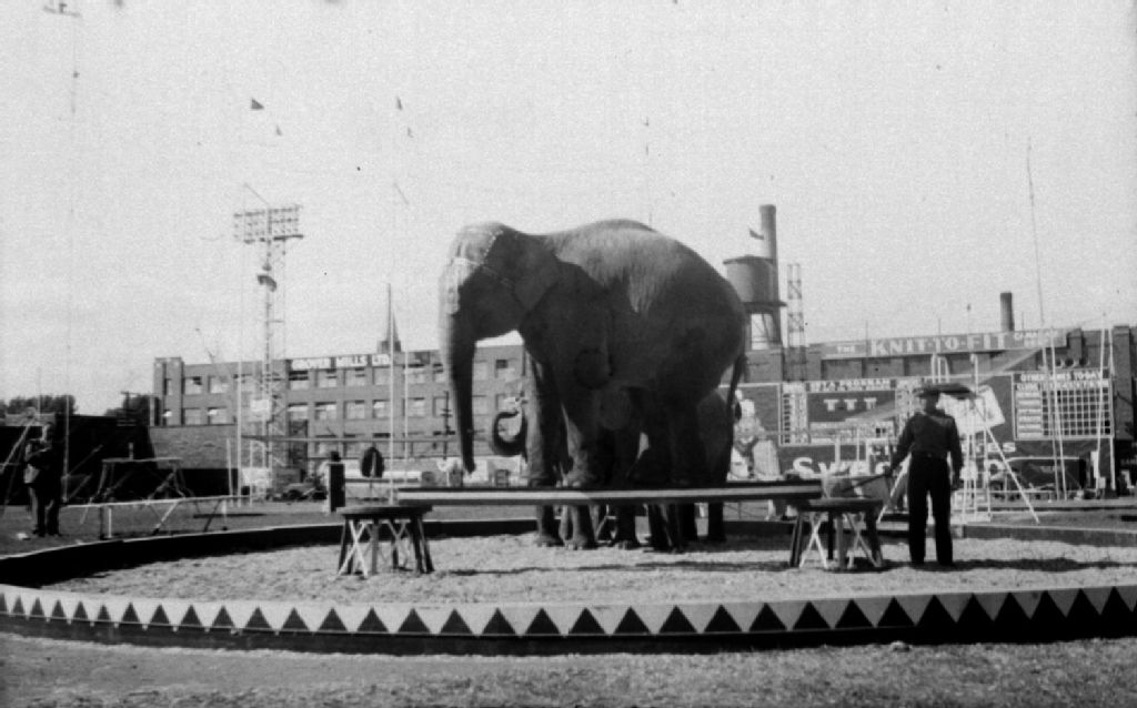 Trois éléphants dressés présentent un numéro de cirque au stade Delorimier à Montréal. Nous remarquons la manufacture Grover Mills Ltd. Knit to Fit à l'arrière-plan