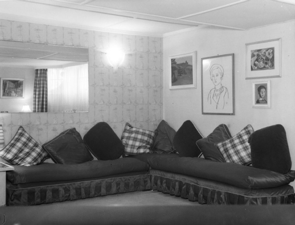 Nous voyons un divan en coin dont les coussins forment le dossier dans une pièce de la résidence du docteur Gariépy