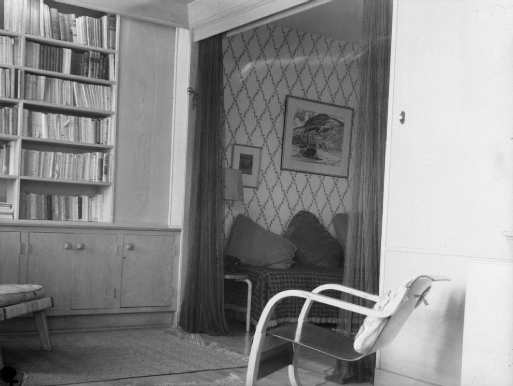 Un rideau sépare la bibliothèque de la salle de séjour chez le docteur Gariépy
