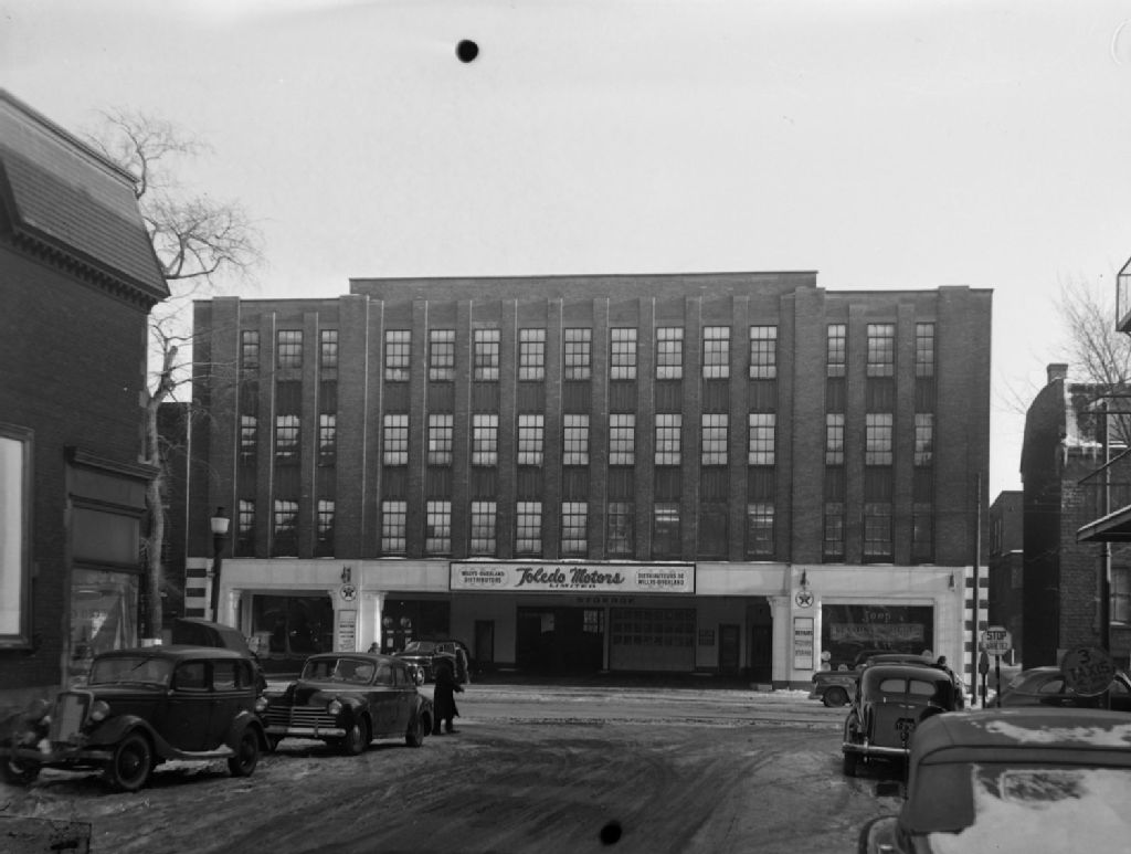 Nous voyons l'édifice de Toledo Motors, distributeurs de Willys-Overland, situé rue Sainte-Catherine Ouest à Montréal