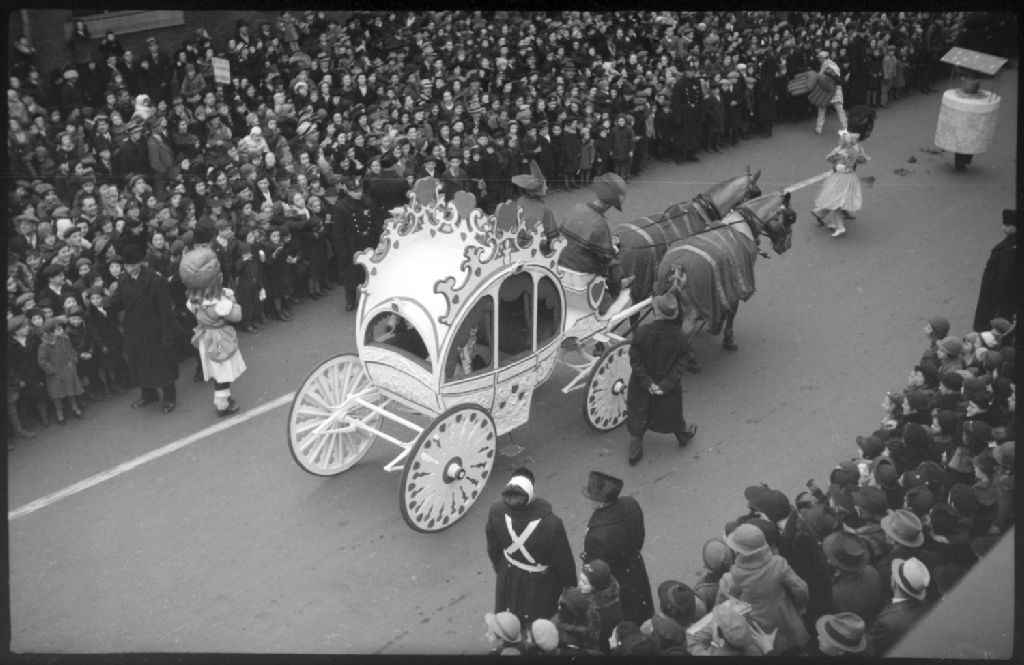Lors de la parade du Père Noël à Montréal, nous voyons le carrosse de Cendrillon, tiré par deux chevaux. Deux cochers coiffés de bicornes conduisent ce fiacre