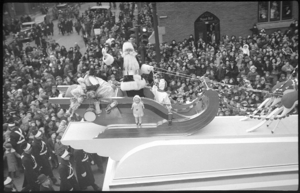Lors de la parade du Père Noël à Montréal, nous voyons le Père Noël, en compagnie d'un lutin, dans son traîneau rempli de cadeaux. À l'arrière-plan, nous apercevons le portique du «Synod Hall», 1641 rue University à Montréal et la foule des spectateurs