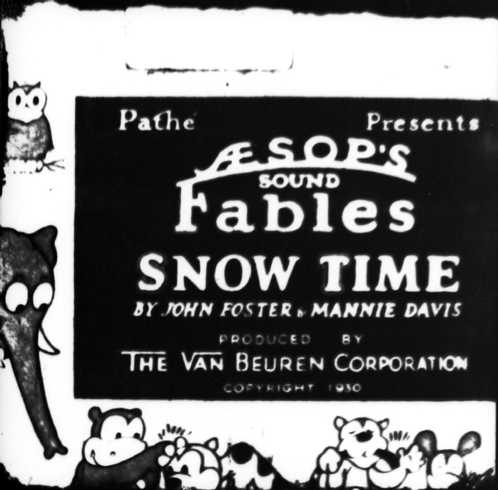 Nous voyons le titre du film de dessins animés de Pathé «Snow Time» consacré aux fables d'Ésope