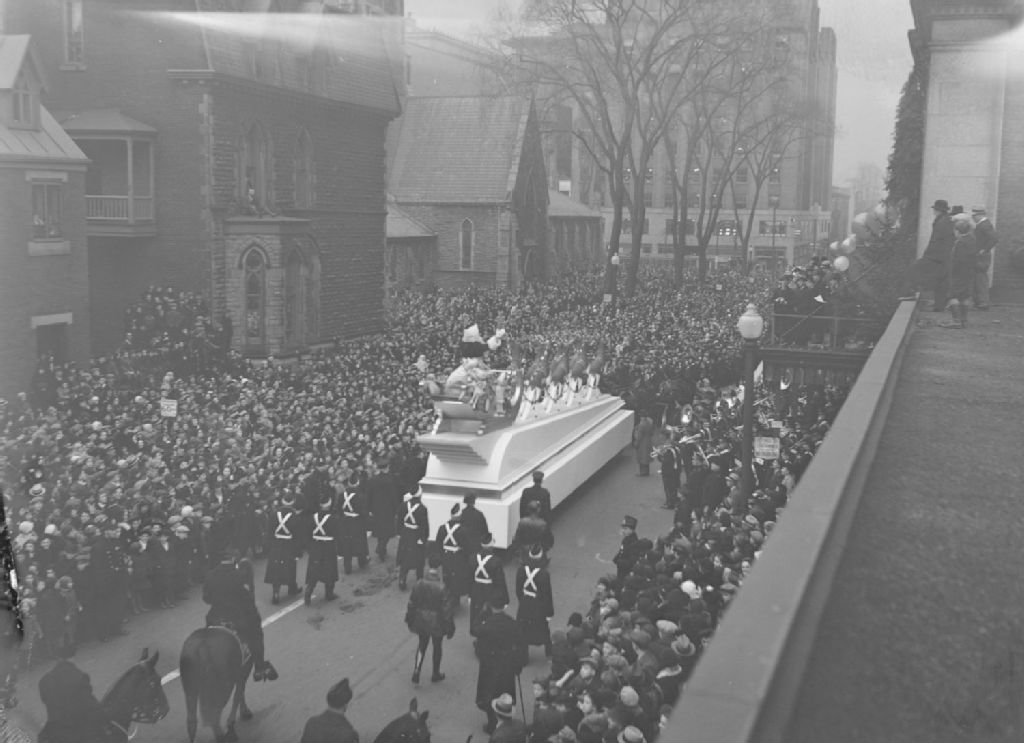 Lors de la parade du Père Noël à Montréal, nous voyons le char allégorique du Père Noël suivi par des fantassins et des cavaliers en uniforme, défilant le long de la rue Sainte-Catherine Ouest à Montréal, près du magasin Eaton et de la cathédrale «Christ Anglican Church»