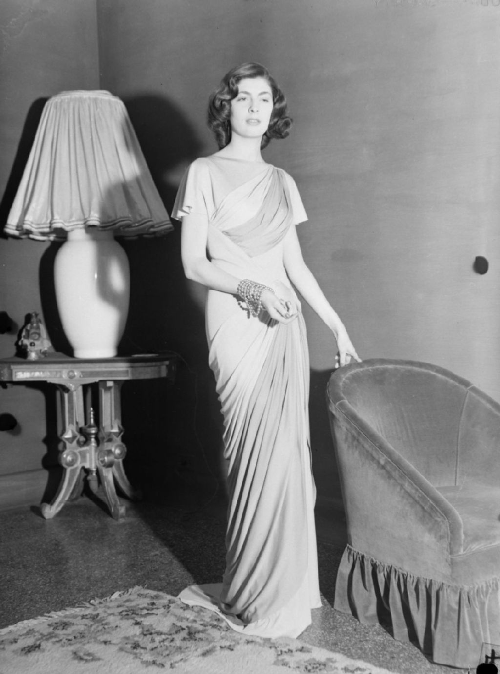 Un mannequin porte une robe longue dans la boutique de haute couture de Raoul Jean Fouré située au rez-de-chaussée des New Sherbrooke Apartments de la rue Sherbrooke Ouest à Montréal