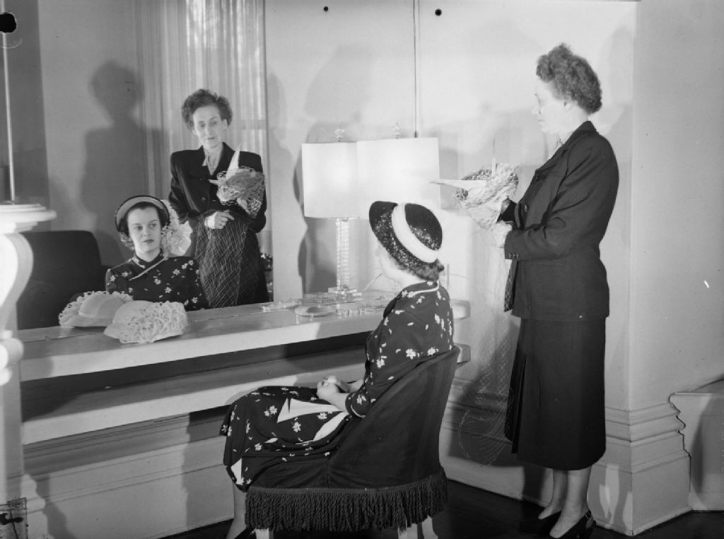 Une cliente, aidée d'une vendeuse, essaie des chapeaux à la boutique Alice Modes de la rue Mackay à Montréal