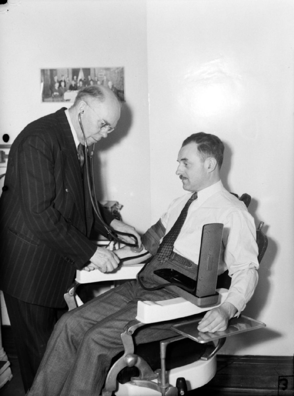 Un médecin prend la tension artérielle d'un wattman qui passe un examen médical