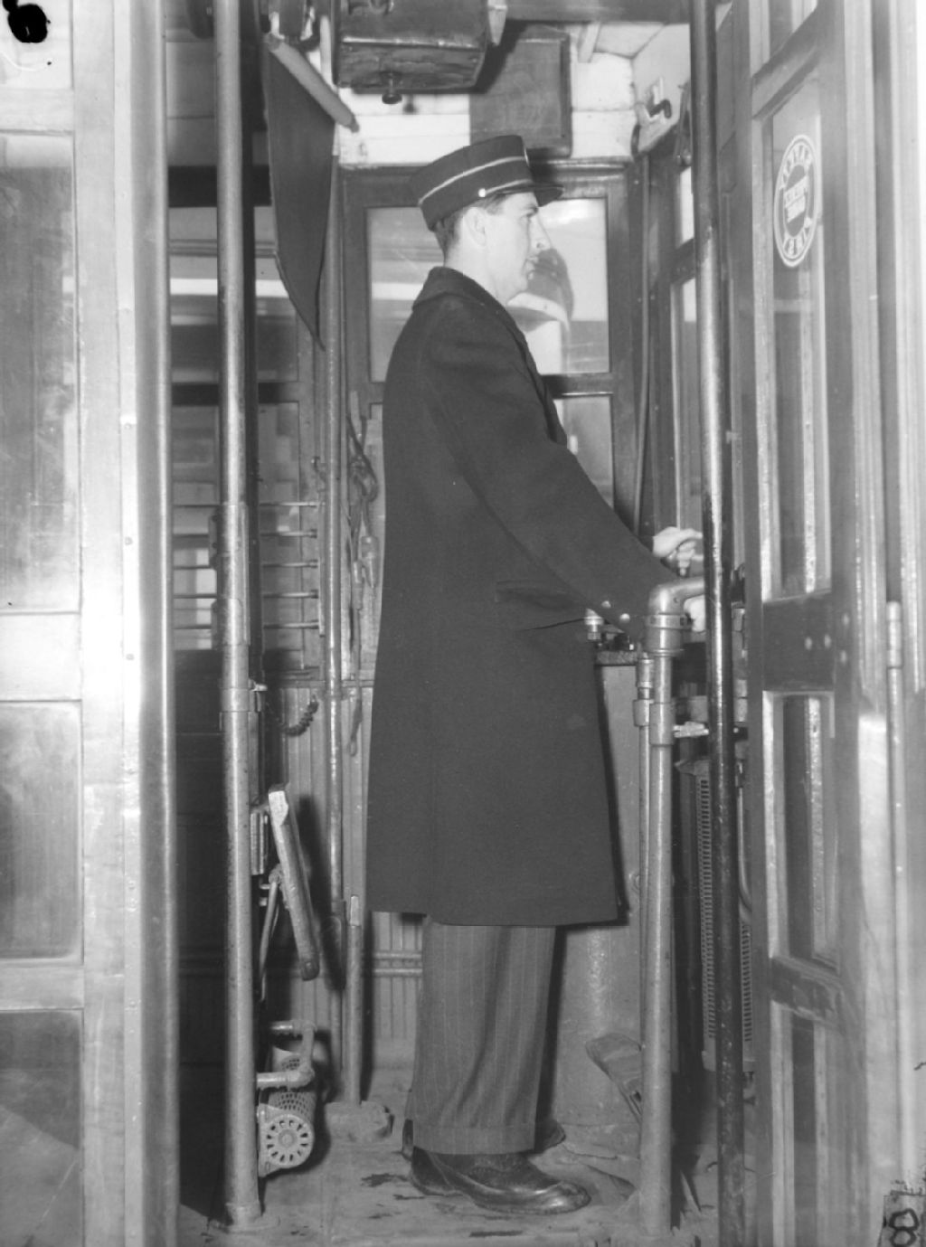 Nous voyons un wattman aux commandes d'un tramway de la Montreal Tramways Co
