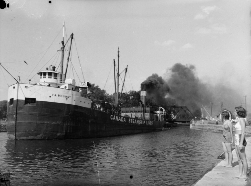 Le cargo «Fairmount» des «Canada Steamship Lines» franchit les écluses du canal de Lachine à Montréal. Nous voyons deux baigneuses sur la berge