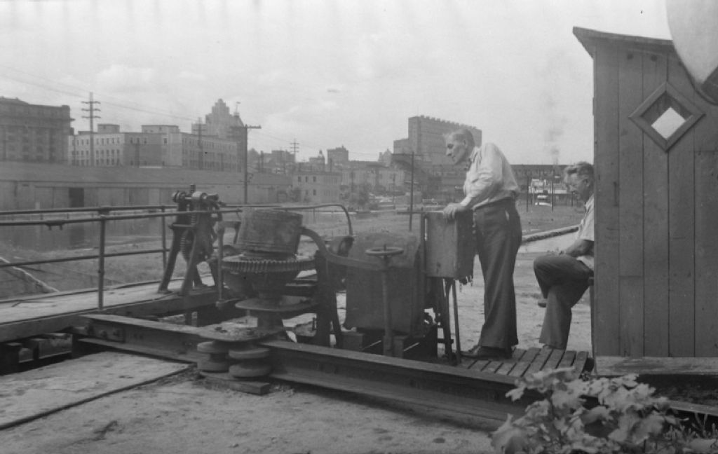L'éclusier procède aux manoeuvres d'ouverture des portes d'une écluse au canal de Lachine à Montréal. Il tourne la manivelle du système d'engrenage