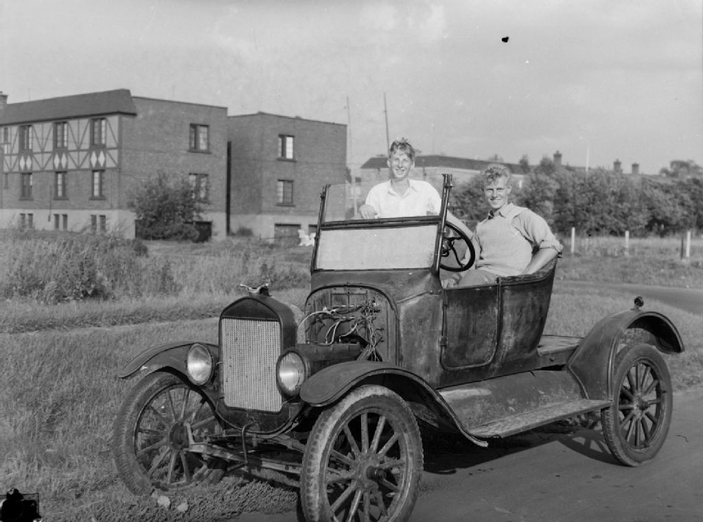 Deux jeunes hommes sont assis dans une voiture Ford 1923