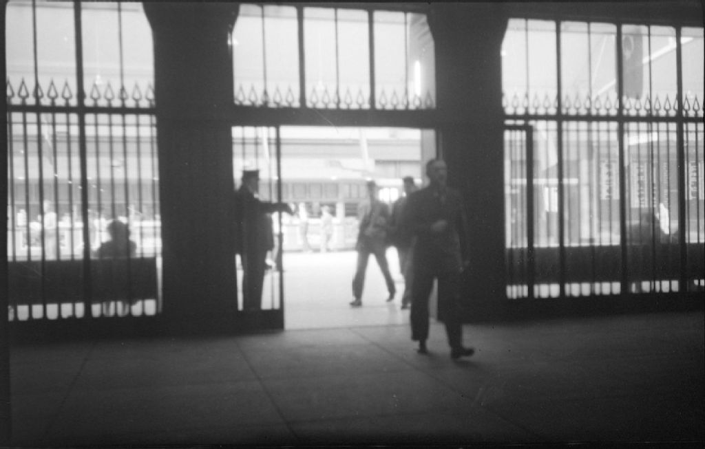 Les voyageurs descendus du train entrent dans la gare Windsor à Montréal. Un contrôleur se tient à la barrière