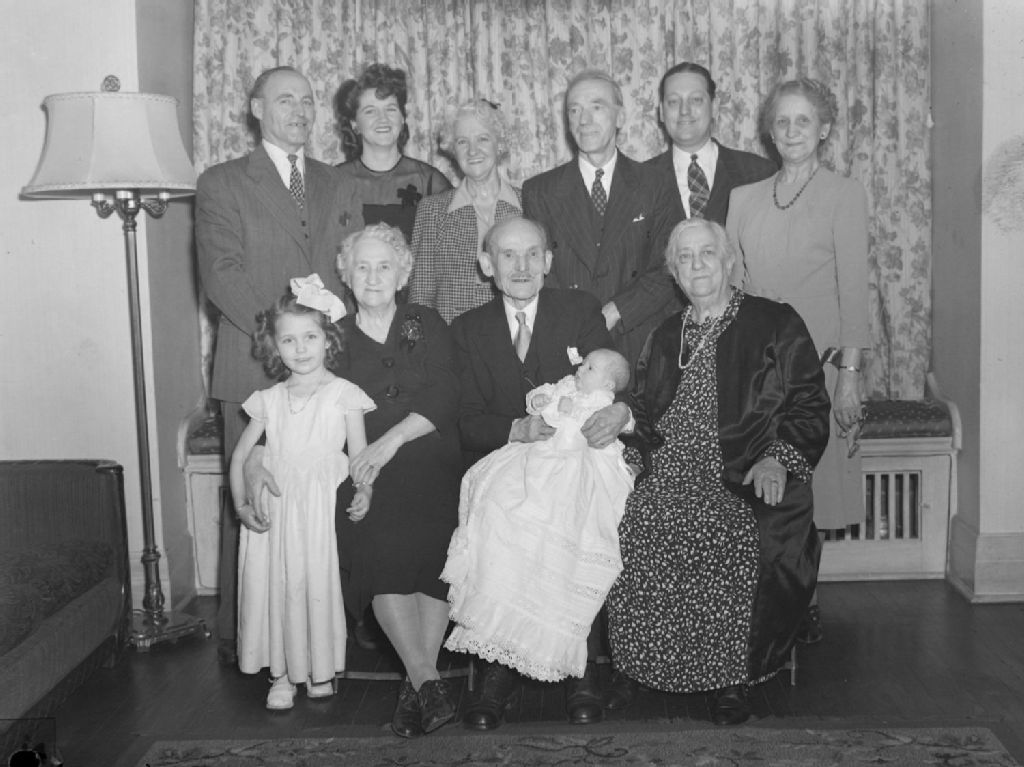 La famille est réunie pour le baptême de l'enfant de madame et monsieur Walter Clarke. Le grand-père tient le bébé alors que la grand-mère serre une fillette contre elle