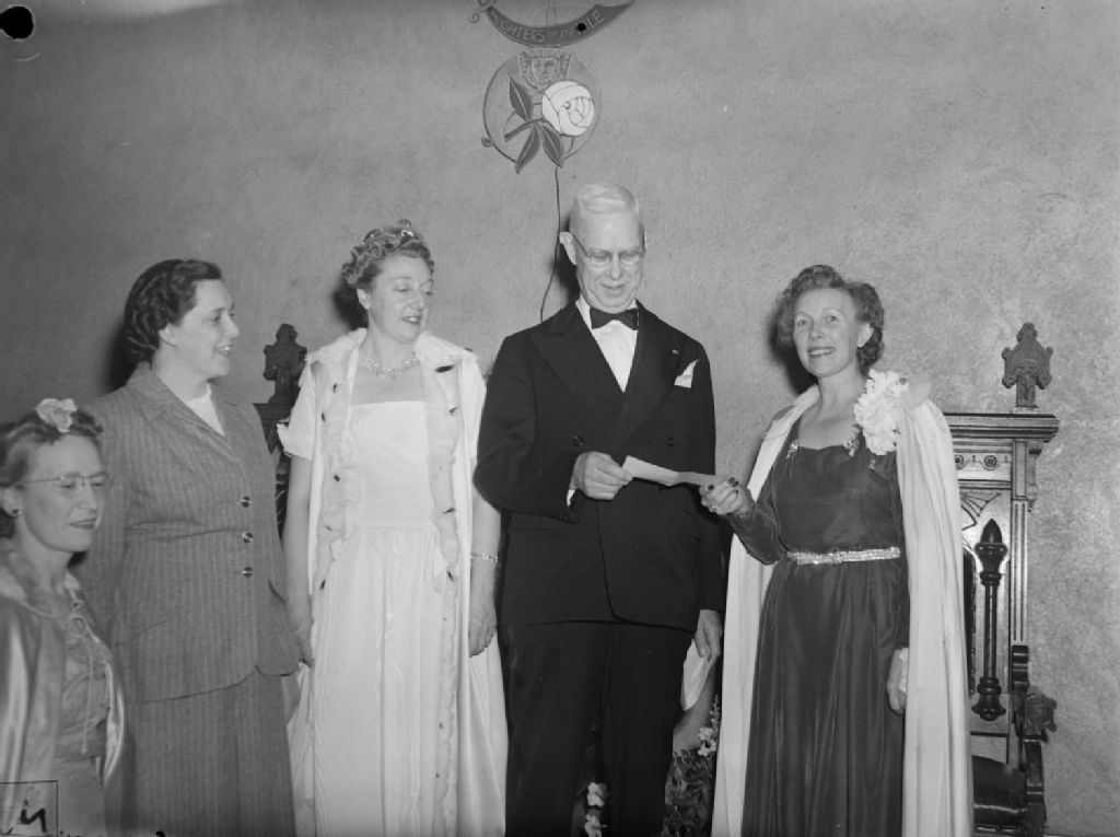 Une bénévole, membre de l'organisme de charité Daughters of the Nile qui vient en aide aux enfants de Shriners Hospital for Crippled Children situé avenue Cedar à Montréal, reçoit un chèque d'un dignitaire. Madame Norman Johnston est à ses côtés