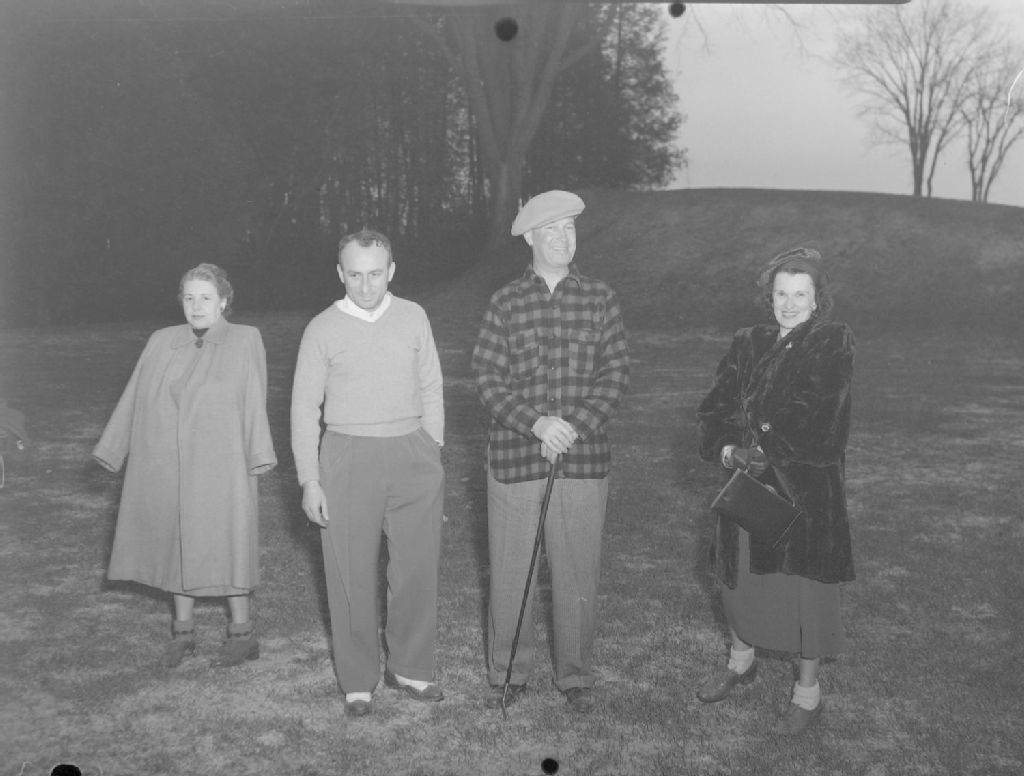 Le chanteur fantaisiste français Maurice Chevalier, en chemise à carreaux, joue au golf au club de golf Islesmere de Sainte-Dorothée de Laval