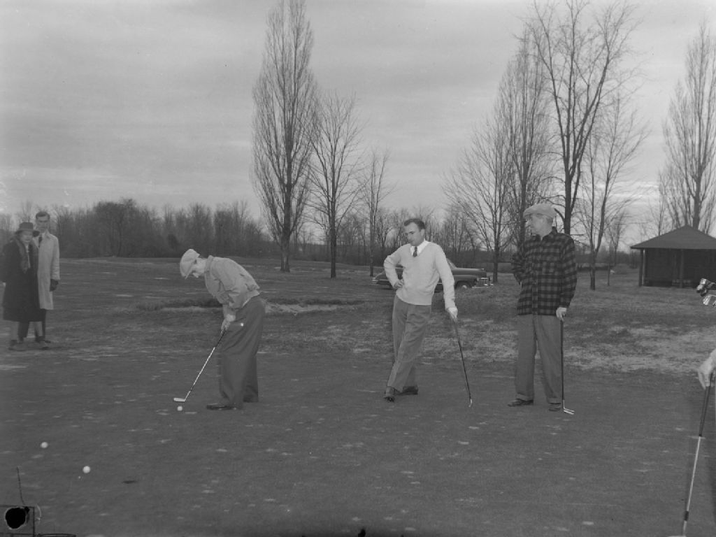 Le chanteur fantaisiste français Maurice Chevalier, en chemise à carreaux, joue au golf au club de golf Islesmere de Sainte-Dorothée de Laval